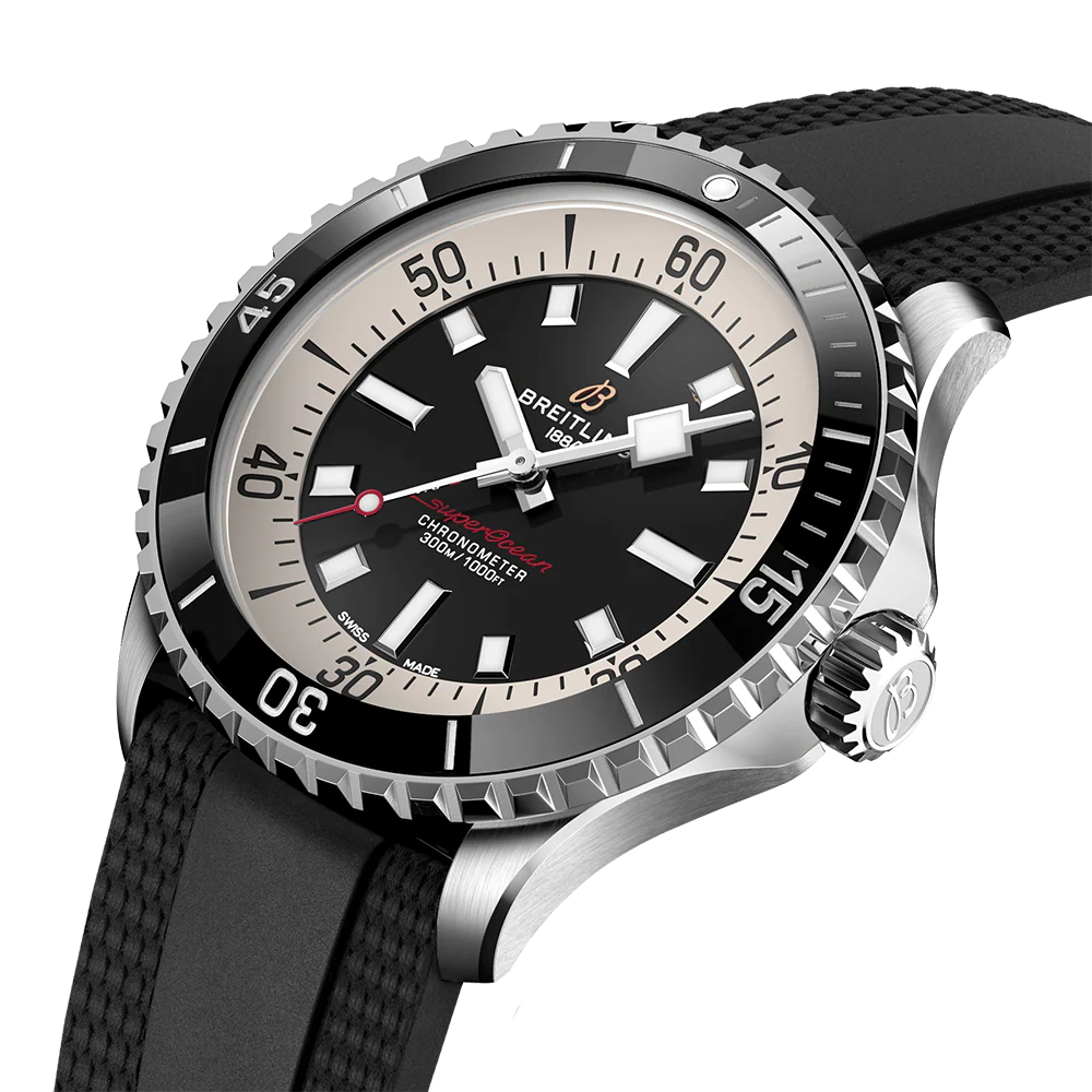 Aside from looking good, the new Superocean is also a technical marvel. Broad hands and indexes coated in luminescent Super-LumiNova allow for superior readability underwater. At 300 m (1000ft) water resistance, this watch triples the minimum requirement for dive watches. The two strap options (rubber and metal bracelet) have a folding clasp that allows for micro-adjustments of up to 15 mm for easy wear over rashies and dive suits. Its scratch-proof ceramic-inlayed bezel means it will never wear or fade. For safety, the bezel is uni-directional on most sizes and bi-directional with a patented lock on the 46 mm. This watch is also shock, -sand-and saltwater-resistant. Its automatic Breitling Caliber 17 comes with a two-year warranty and approximate 38-hour power reserve.