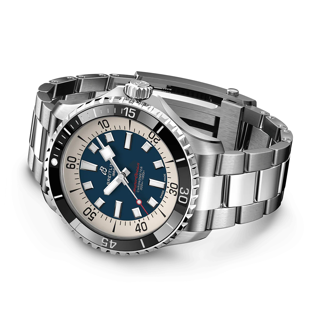 Aside from looking good, the new Superocean is also a technical marvel. Broad hands and indexes coated in luminescent Super-LumiNova allow for superior readability underwater. At 300 m (1000ft) water resistance, this watch triples the minimum requirement for dive watches. The two strap options (rubber and metal bracelet) have a folding clasp that allows for micro-adjustments of up to 15 mm for easy wear over rashies and dive suits. Its scratch-proof ceramic-inlayed bezel means it will never wear or fade. For safety, the bezel is uni-directional on most sizes and bi-directional with a patented lock on the 46 mm. This watch is also shock, -sand-and saltwater-resistant. Its automatic Breitling Caliber 17 comes with a two-year warranty and approximate 38-hour power reserve.