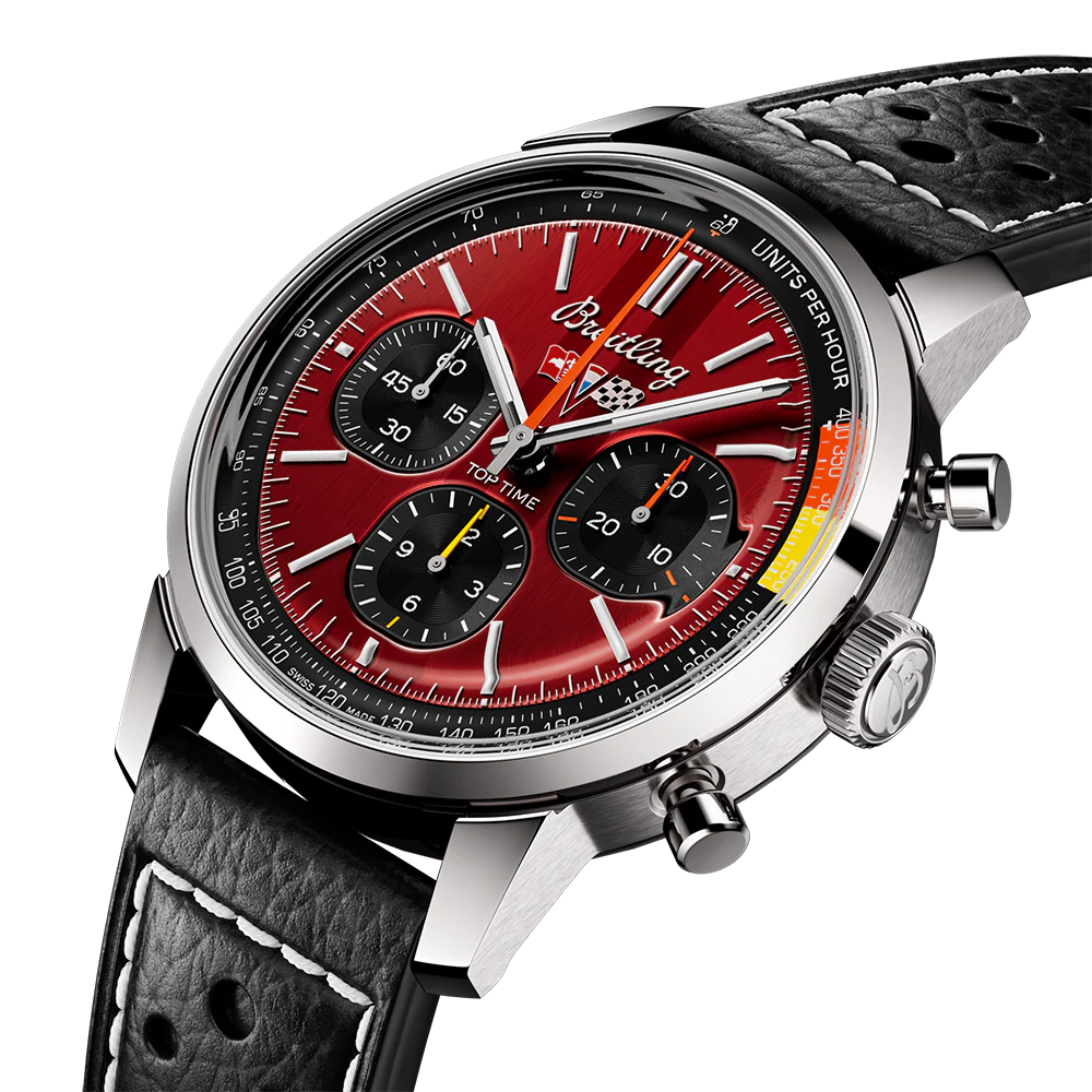 The 1960s was a decade of experimentation, fun, freedom and energy. Whether cruising on a motorcycle or revving up a sportscar, living life at full speed was the order of the day. Willy Breitling felt this change of pace and set out to design an unconventional chronograph that would capture the verve of era. He called it the Top Time. That spirited tradition continues today with Breitling partnering with some of the coolest names in wheels to create its Top Time designs. The second-generation Chevrolet Corvette, from the 1963 to 1967 model years, is the most sought-after version of the American legend. The “Sting Ray,” as it was known, took inspiration from a 1959 racing-model prototype. For 60 years, it has captured the imaginations of car lovers around the world with its perfect combination of a low-profile body and a powerful engine that delivers performance whether on the road or on the track. The Top Time B01 Chevrolet Corvette features the colours and emblem of its classic-car counterpart as well as a perforated leather racing strap, speed-measuring tachymeter scale and contrasting “squircle” (not quite square, not quite round) subdials that give the feel of vintage dashboard gauges. It also comes with a brag-worthy engine under the hood: the exceptional Breitling Manufacture Caliber 01.