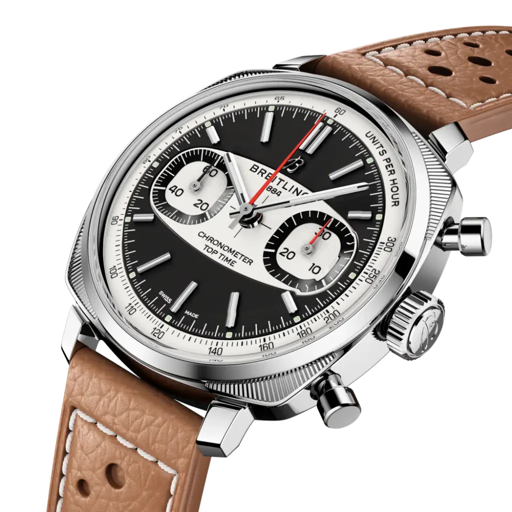 Introduced in the transformative 1960s, Willy Breitling’s unconventional line of racing-inspired chronographs captured the era’s freewheeling vibe. Today, the new Top Time collection channels that adrenaline-fueled energy, blending modern-retro design with cutting-edge performance The Top Time Racing is a descendant of some of the most striking Top Time designs of the 1960s. The cushion-shaped case, bold tachymeter scale, and distinctive “squircle” subdials evoke the high speeds and split-second decisions of the race route. At the heart of the dial is the signature “surfboard” motif—an elliptical design straight out of the Top Time archives, inspired by classic-car dashboards.