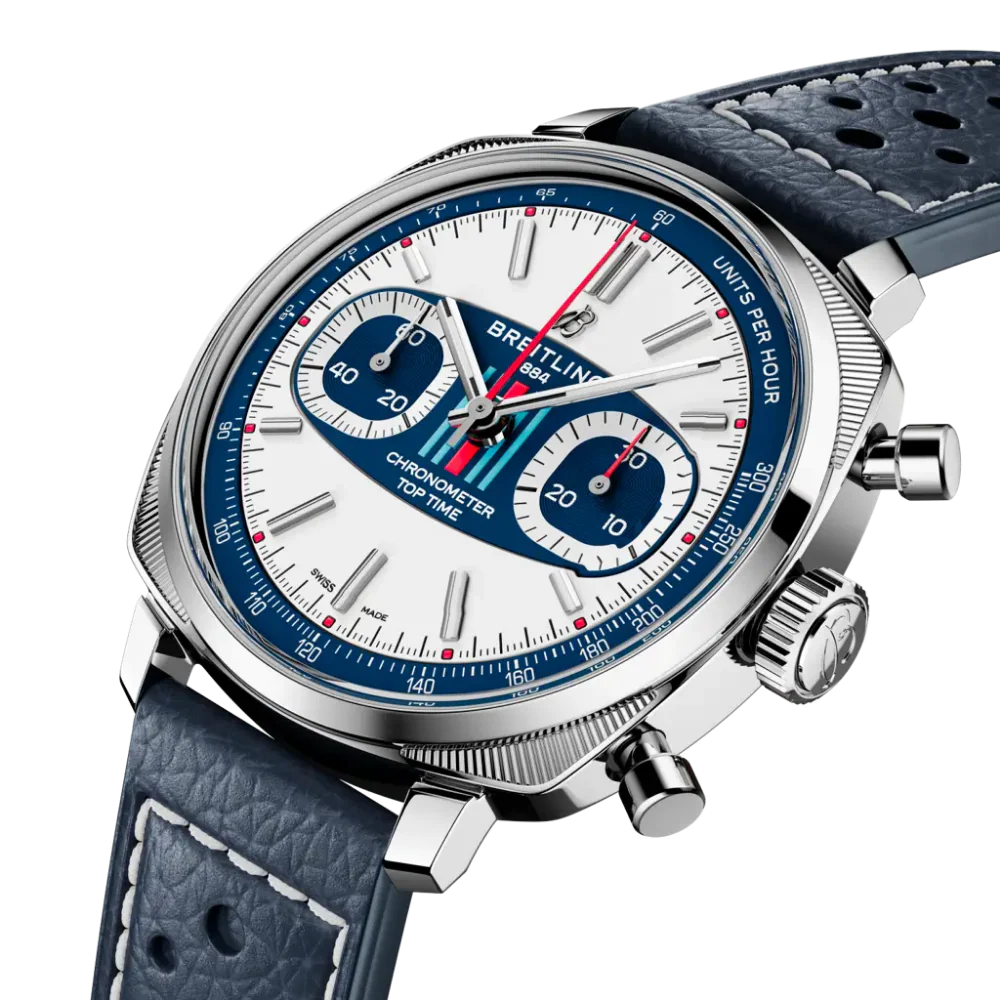 Introduced in the transformative 1960s, Willy Breitling’s unconventional line of racing-inspired chronographs captured the era’s freewheeling vibe. Today, the new Top Time collection channels that adrenaline-fueled energy, blending modern-retro design with cutting-edge performance. Instantly recognizable, the Top Time Martini Racing takes its cues from one of the most celebrated liveries of all time. Its dial is dominated by Martini Racing’s signature light blue, dark blue, and red stripes. It features a modern-retro take on the cushion case, squircle subdials, and the unmistakable surfboard dial design. Sized at a sleek 38 mm, it’s paired with a perforated dark blue calfskin leather strap secured by a folding clasp. Beating inside the watch is the Breitling’s flagship Manufacture Caliber 01—a COSC-certified chronometer built for precision under pressure and featuring a 70-hour power reserve. Limited to 750 pieces, The Top Time Martini Racing blends retro aesthetics with modern comfort.