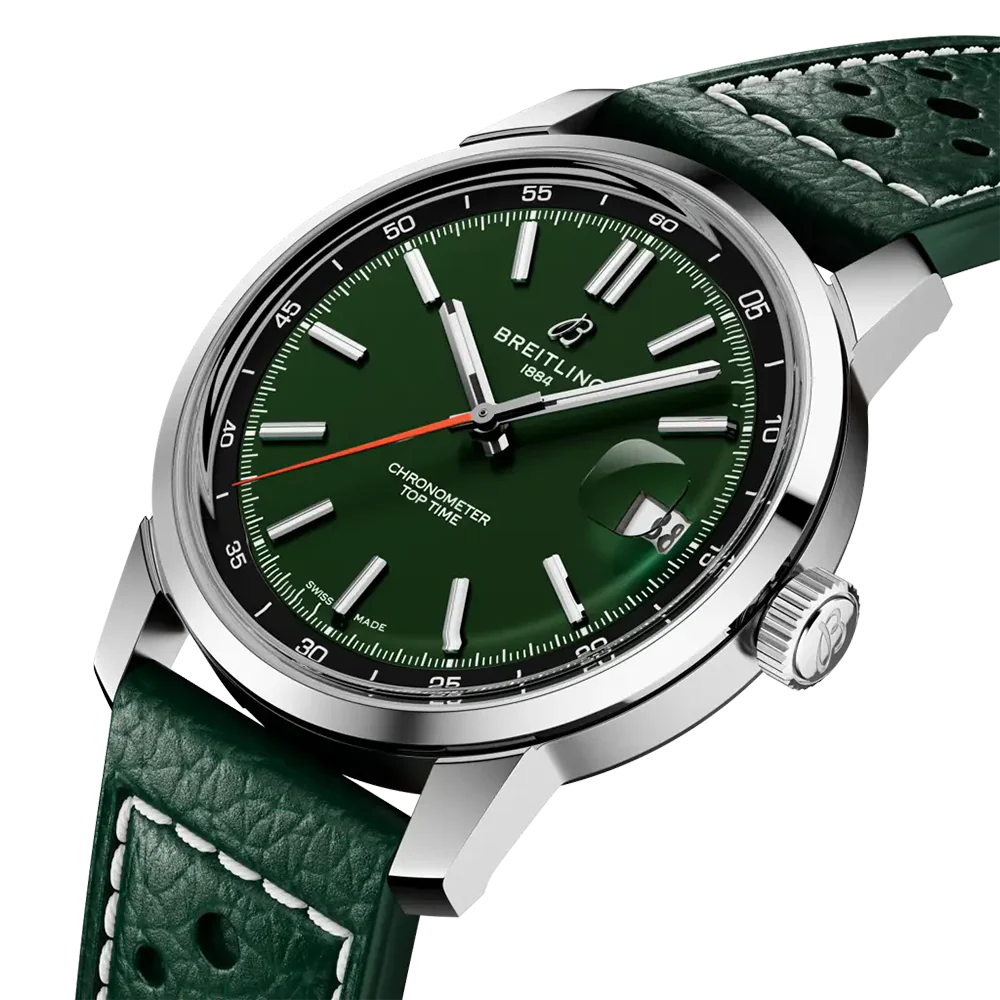 Newly launched in 2025, the Top Time B31 marks the debut of the Manufacture B31 movement at Breitling. A 38mm case, true to Top Time DNA, for an impeccable style that will fit every wrist. The Top Time B31 blends retro aesthetics with a modern edge. Its dial design takes inspiration from classic-car dashboard clocks, while its 38 mm case strikes a balance between vintage proportions and contemporary design, perfect for any wrist thanks to its universal size. Three colorways—green, blue, or a two-tone combination of white and sky-blue—pair with either a three-row stainless-steel bracelet or a perforated calfskin strap that gives a nod to racing gloves. Whether cruising the open road or simply embracing the everyday, this watch is a celebration of individuality and adventure.