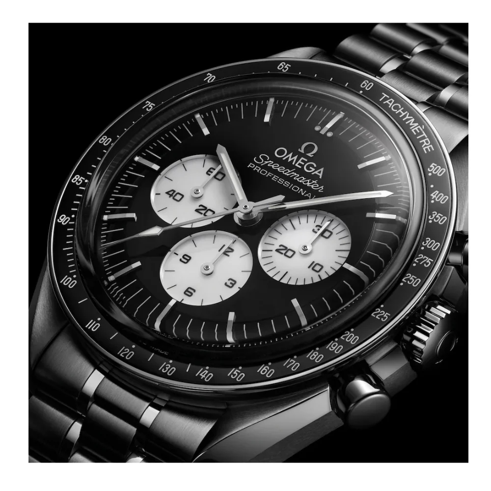 The Speedmaster Moonwatch is one of the world’s most iconic timepieces. Having been a part of all six moon landings, the legendary chronograph is an impressive representation of the brand’s adventurous pioneering spirit. This 42 mm model features sapphire crystal glass on both the front and caseback, presented on a polished-brushed stainless steel bracelet. The design draws inspiration from the 4th generation Speedmaster worn on the moon. Its black varnished and lacquered double plate step dial is complemented by white varnished and lacquered subdials set within rhodium-plated frames. Details include the OMEGA logo and indexes, Moonwatch style hands, and the famous dot over 90 on the black ceramic bezel ring. The watch is driven by the OMEGA Co-Axial Master Chronometer Calibre 3861, which powers the small seconds sub-dial, 30-minute recorder and 12-hour recorder, along with the central chronograph function.