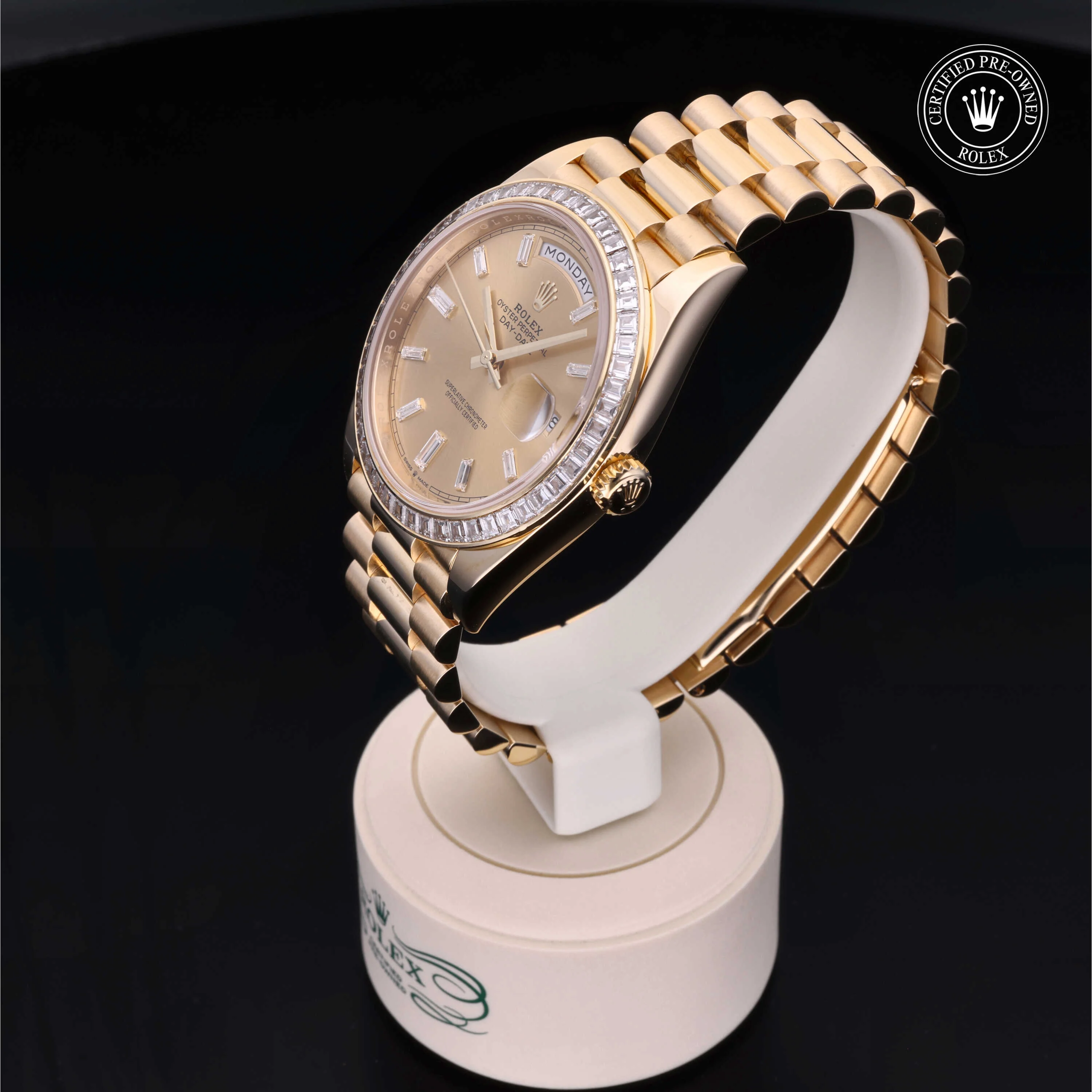 The Day-Date by Rolex was initially launched in 1956. This advanced timepiece became the premier wristwatch capable of displaying both the day and date in their entirety, and only available in 18ct yellow gold and platinum. This timepiece comes with the original box and guarantee. It has been fully serviced including a new crown by our Rolex Accredited Workshop, and a two year warranty is provided by Lunn's. Image shown is of actual timepiece.