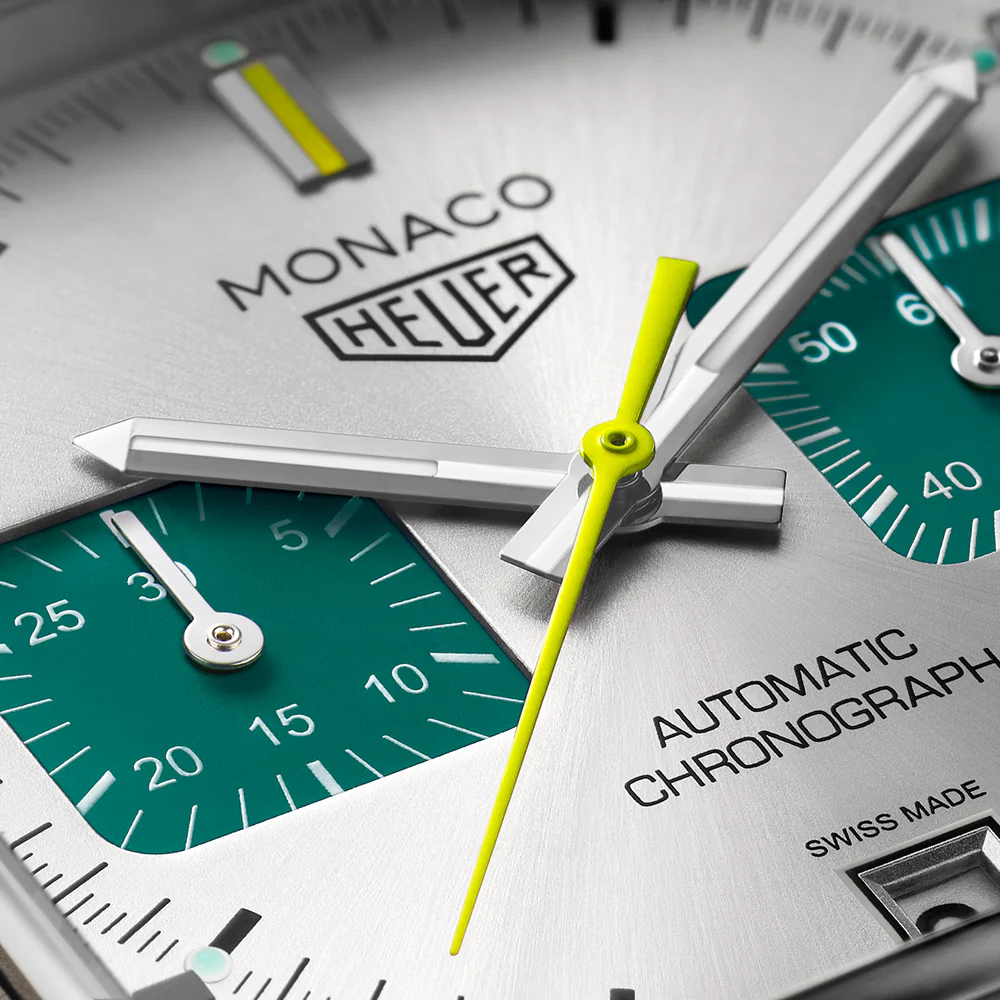 Experience the essence of racing heritage with the TAG Heuer Monaco Chronograph Racing Green. A bold continuation of the Racing colours saga, this charismatic timepiece embodies the vibrant yet elegant aesthetics of the Monaco's indomitable character, inspired by the iconic Racing Green livery—a nod to the storied past of British racing drivers. Ultra-lightweight yet tremendously robust, the 39 mm Grade 2 titanium case comes with a green, perforated calfskin leather strap, adding a touch of racing flair. Powered by the legendary Calibre 11 movement, this limited-edition timepiece is a beacon of precision, while the iconic crown on the left side of the case is a hallmark of the Monaco.